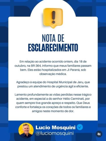> “Lamento profundamente as vidas perdidas nesse trágico acidente, em especial a do senhor Hélio Carminati, por quem sempre tive grande apreço e respeito. Agradeço às equipes do Hospital Municipal de Jaru pelo atendimento ágil e eficiente”, escreveu o parlamentar.