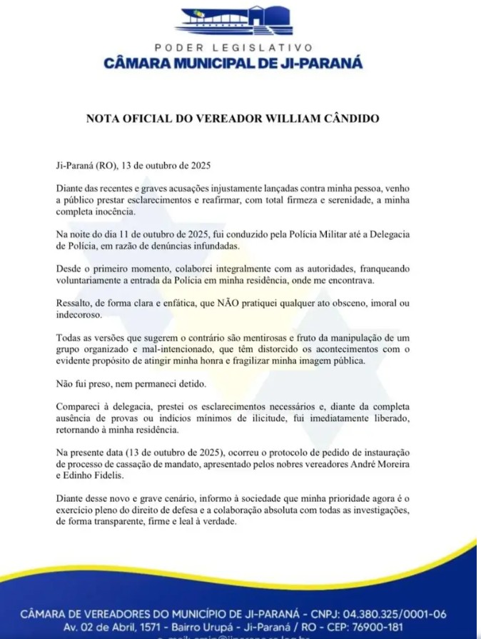 Segundo o texto, o vereador relata ter colaborado integralmente com as autoridades desde o primeiro momento, inclusive autorizando voluntariamente a entrada da Polícia Militar em sua residência. Ele enfatizou que não foi preso nem permaneceu detido, tendo comparecido à delegacia apenas para prestar esclarecimentos.